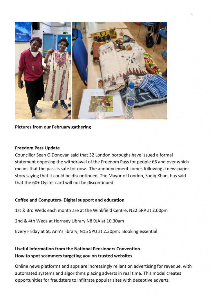 MEETING OR BY BANK TRANSFER TO HARINGEY OVER 50S FORUM, SORT CODE 08 92